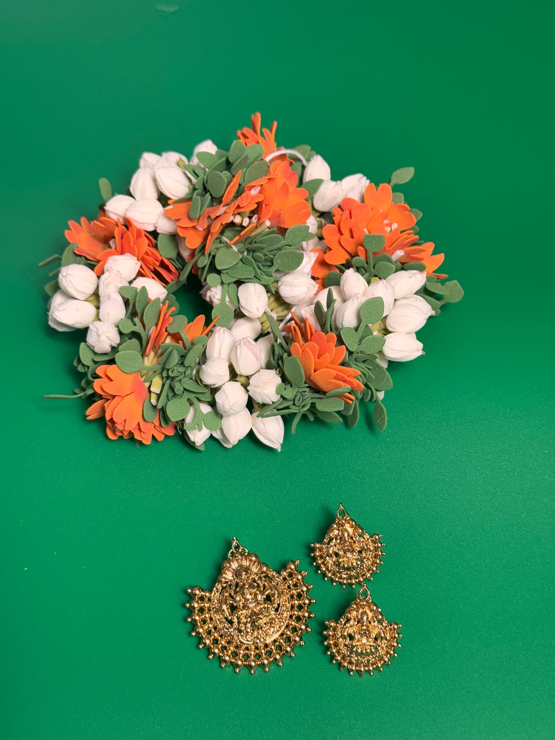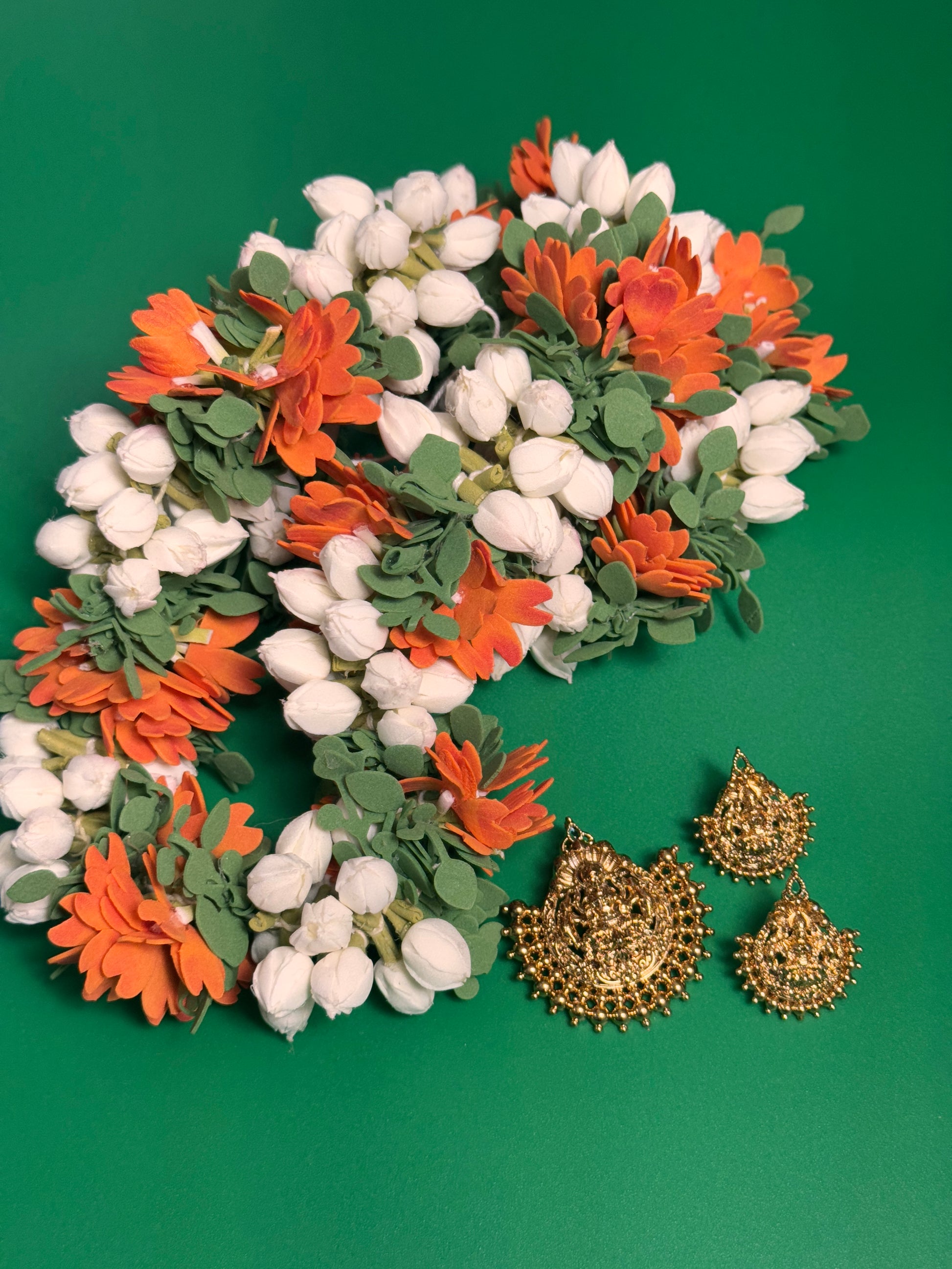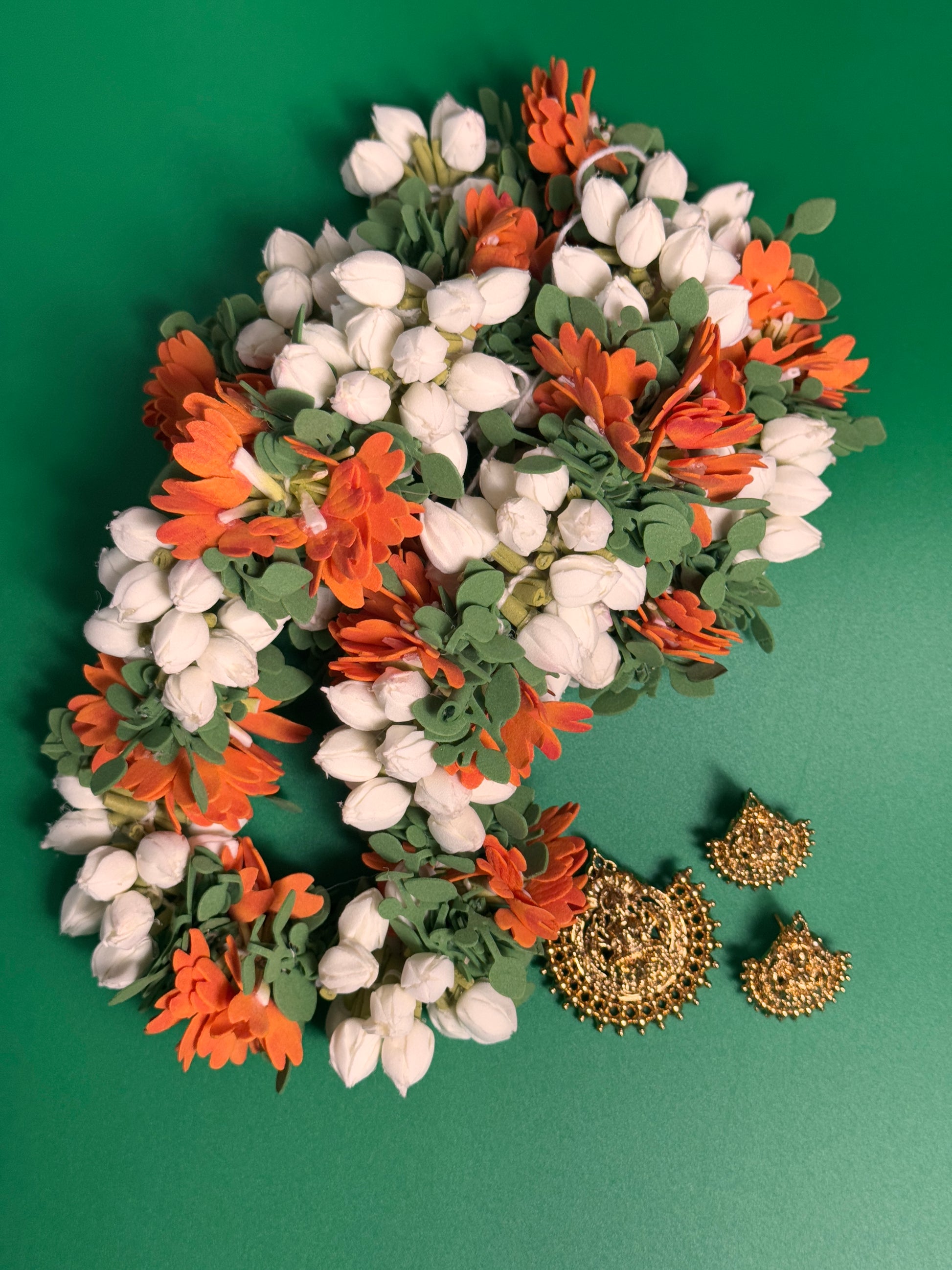 The white buds are tightly packed to mimic the fullness of real jasmine, while the occasional red rose flowers add a festive pop—just like the ones used in temple offerings and South Indian celebrations.