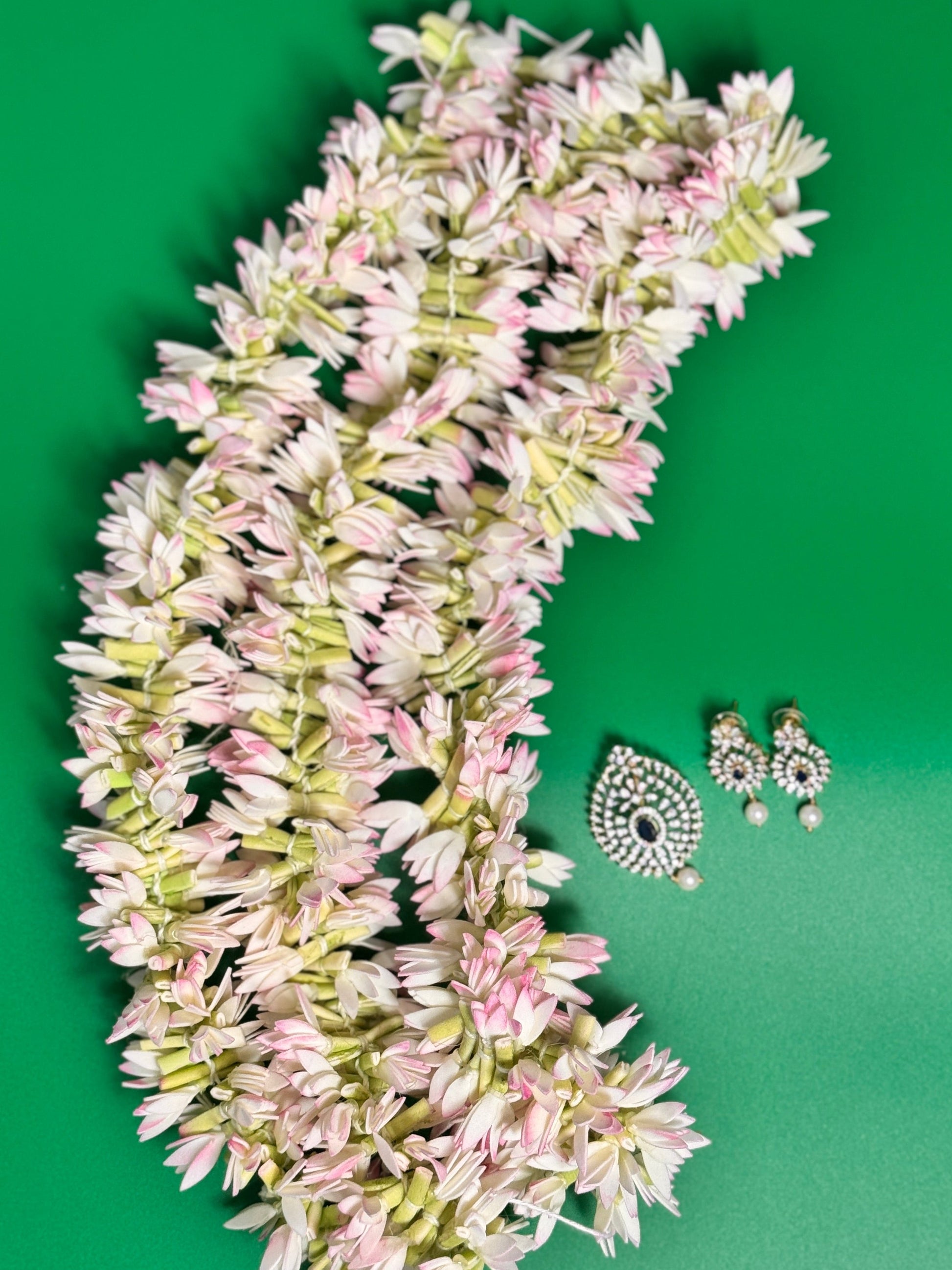 The white buds are tightly packed to mimic the fullness of real jasmine, while the occasional red rose flowers add a festive pop—just like the ones used in temple offerings and South Indian celebrations.