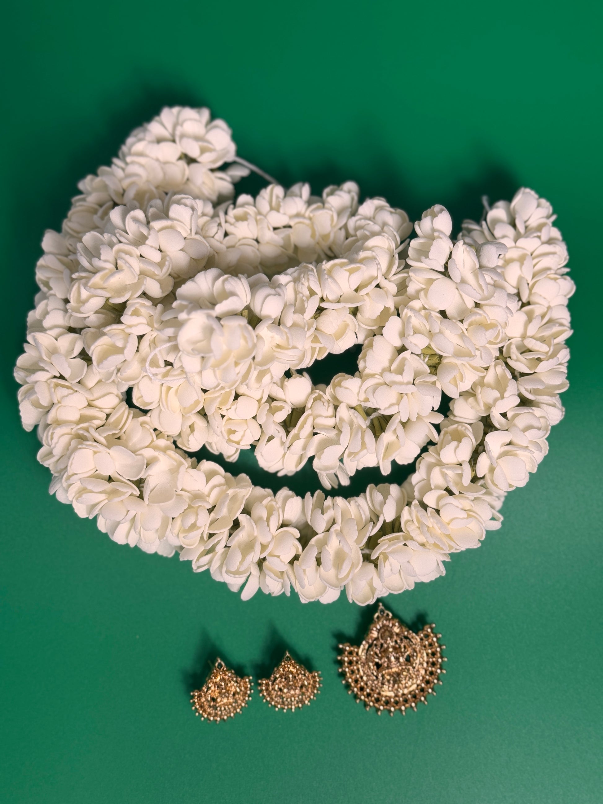 The white buds are tightly packed to mimic the fullness of real jasmine, while the occasional red rose flowers add a festive pop—just like the ones used in temple offerings and South Indian celebrations.